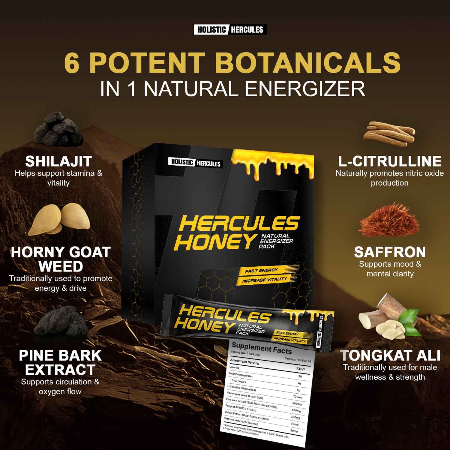 Unlike dangerous gas station supplements, Hercules Honey contains clinically-dosed, pure ingredients: 700mg micronized L-Citrulline for blood flow, 500mg standardized Horny Goat Weed, and gold-grade purified Shilajit. No synthetic chemicals or unknown substances.